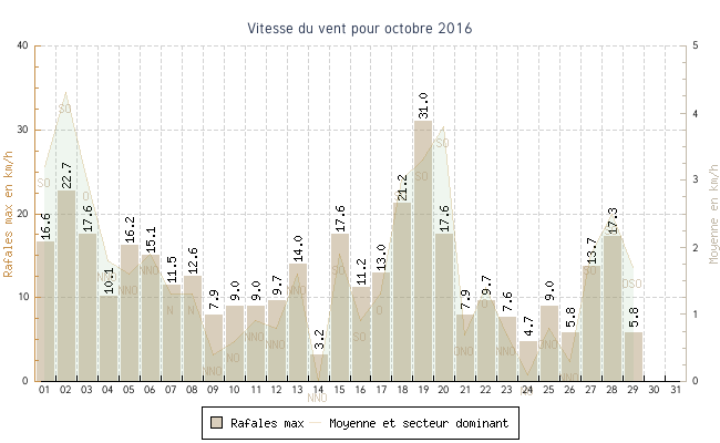 | min | max | moy | Vitesse (rafales) | Secteur | ||